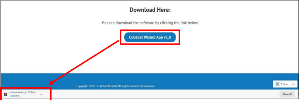 - At bottom of the page, click on “CubeSat Wizard App v1.0” to download the software.