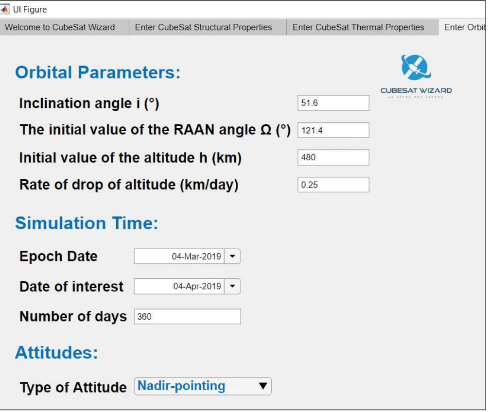 The next Tab requires the user to input orbital parameters, Epoch date for simulation and