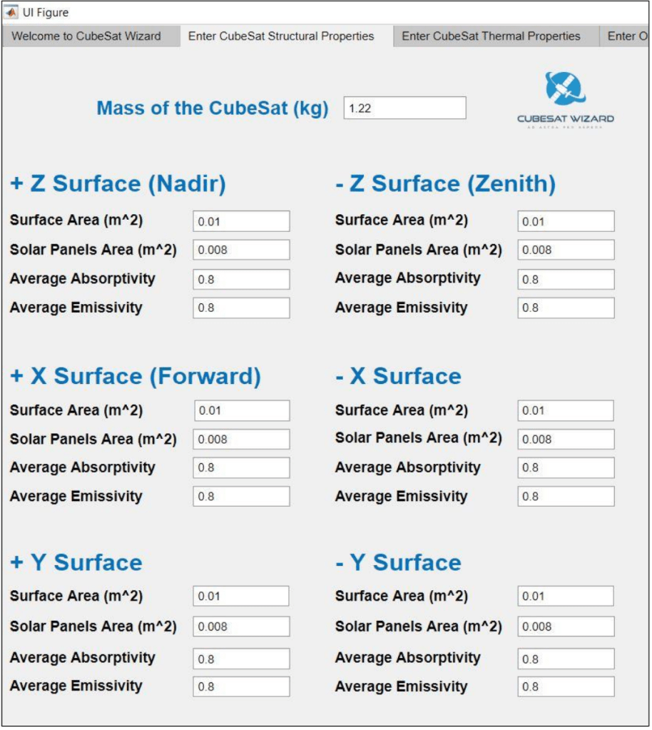 In this Tab, the user is required to enter all the structural properties of the CubeSat. The surface properties of the structure of the CubeSat depend on the design of the CubeSat and the material properties. The App requires the user to enter surface parameters for each face. For example, a 1U CubeSat which is of 10 x 10 x 10 cm dimensions, the average mass is considered to be in the range of 1.0 Kg – 1.33 Kg. The surface area will be 0.01 m2 . In this tutorial, we have considered a 1U CubeSat with a mass of 1.22 Kg, surface area for each face is 0.01 m2 , solar panel area is considered to be 0.008 m2 , average absorptivity and emissivity for each face is chosen to be 0.8. The App considers the Positive Z-Axis to be the face pointing towards Nadir (center of Earth).