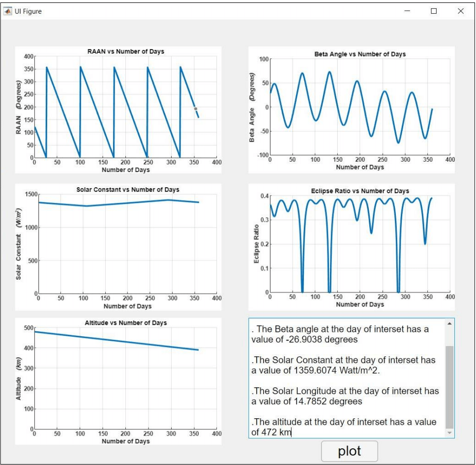 Beta angle, Solar constant, Eclipse ratio and Altitude over the number of days. The results tab