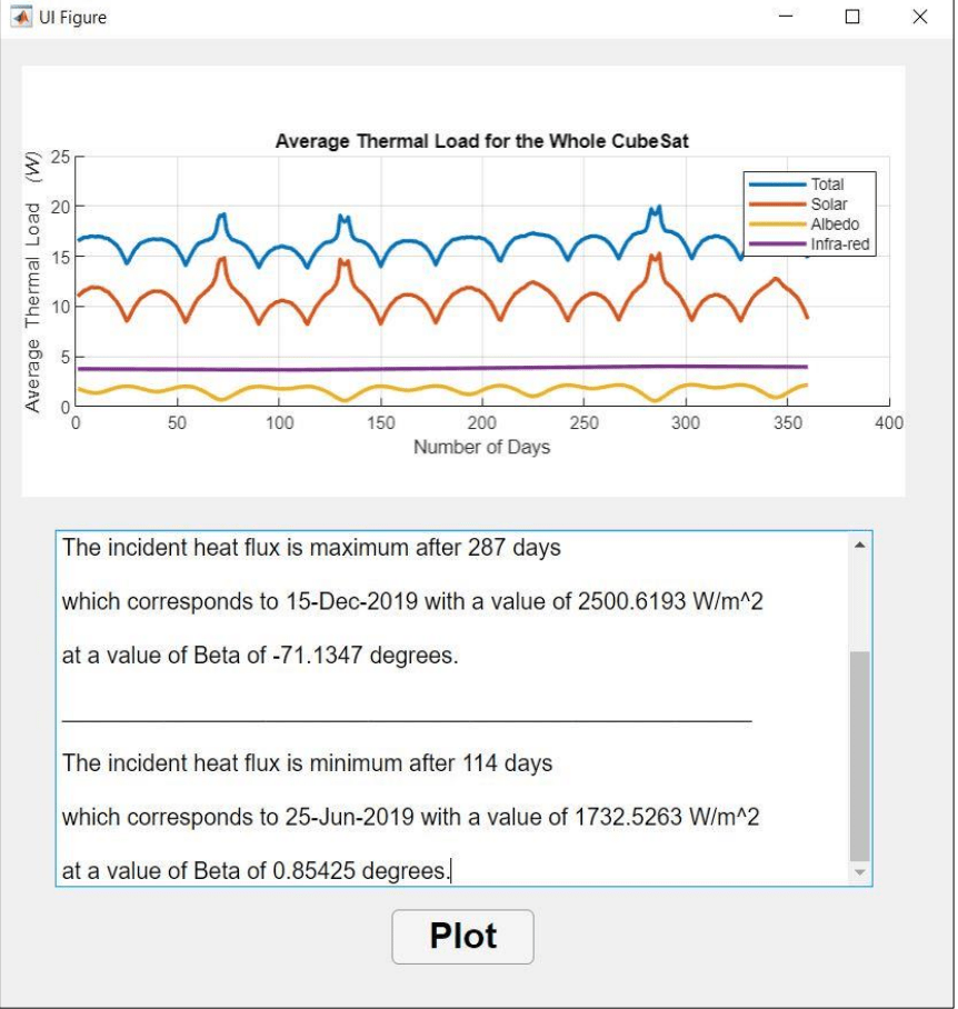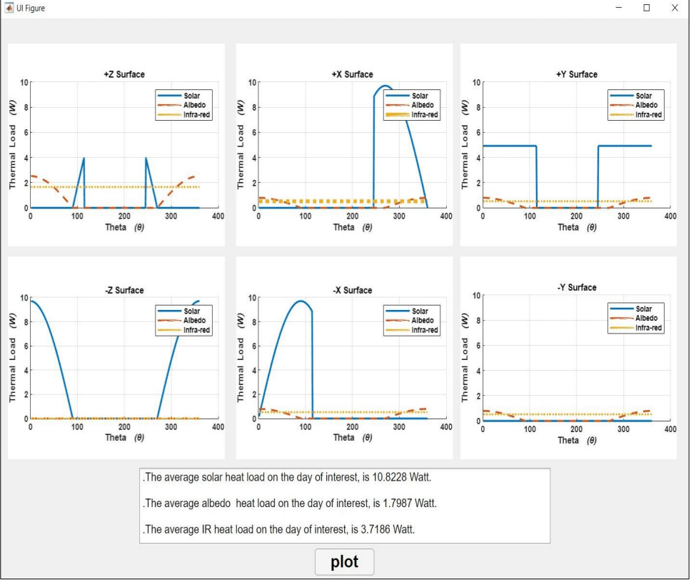 This tab generates result for the full thermal load of the whole CubeSat for one complete orbit. The total thermal load result is inclusive of total direct solar load, total albedo load and total infra-red load that was measured on each surface. The result window below the plot calculates the average total heat load on the day of interest that includes the thermal load of direct solar, albedo and infra-red.